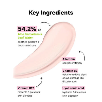 54.2% Aloe Barbadensis Leaf Water helps soothe skin exposed to the sun while delivering refreshing hydration. Hyaluronic Acid and Allantoin help retain moisture and calm irritation, keeping the skin comfortable throughout the day.